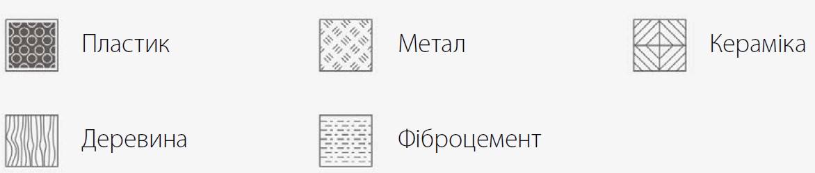 •• Матеріали: пластмаси, метал, кераміка, деревина, фіброцемент.