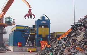 Пресс-ножницы — это основной тип оборудования, применяемого в процессе переработки лома. Задачей этой машины является резка лома «в размер» для облегчения его транспортировки и загрузки в электропечь. В пресс-ножницах сначала происходит уплотнение лома, затем его подпрессовка и, наконец, резка.