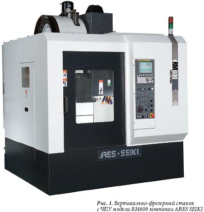 Специализация компании ARES SEIKI — производство оборудования сверлильно-фрезерной группы. К особенностям ее станков относятся повышенная скорость перемещений холостого хода, усиленная ось Z с сервоприводом мощностью 3,5 кВт, компактные габариты, что дает возможность производить качественное фрезерование, сверление и растачивание отверстий, а также «жесткое» нарезание резьбы как в единичном, так и серийном производстве. Среди 12 моделей, составляющих производственный ассортимент компании, наиболее применимой к условиям отечественного производства является вертикально-фрезерный станок с ЧПУ модели RM600 (рис. 1). К особенностям данной машины относятся низкоинерционный шпиндель на 60–12 000 об/мин, жесткое нарезание резьбы на скорости 3000 об/мин, конус шпинделя BT-40, линейные направляющие по 3 осям, скорость перемещения по осям X, Y, Z — 36 м/мин, высокоскоростная система смены инструмента-Т-Т за 2,0 секунды, наличие СЧПУ MITSUBISHI M70. Технические характеристики станка приведены в табл. 1.