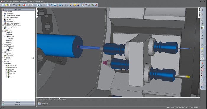 С каждой новой версией в FeatureCAM расширяется номенклатура поддерживаемых токарно-фрезерных обрабатывающих центров со сложной компоновкой. Например, в FeatureCAM 2015R1 была реализована поддержка станков, оснащенных поворотным противошпинделем (BW-ось), захватным устройством, программируемыми люнетами и деталеуловителем. В FeatureCAM 2015R2 появилась поддержка многошпиндельных головок (рис. 4), геометрию которых можно задавать непосредственно средствами 3D-моделирования самой CAM-системы. Пользователь должен присвоить элементам 3D-модели многошпиндельной головки специальные атрибуты, позволяющие CAM-системе распознать тип и параметры установленного в неё инструмента. В процессе компьютерной симуляции обработки все перемещения многошпиндельнй головки отслеживаются наравне со всеми другими рабочими органами станка.