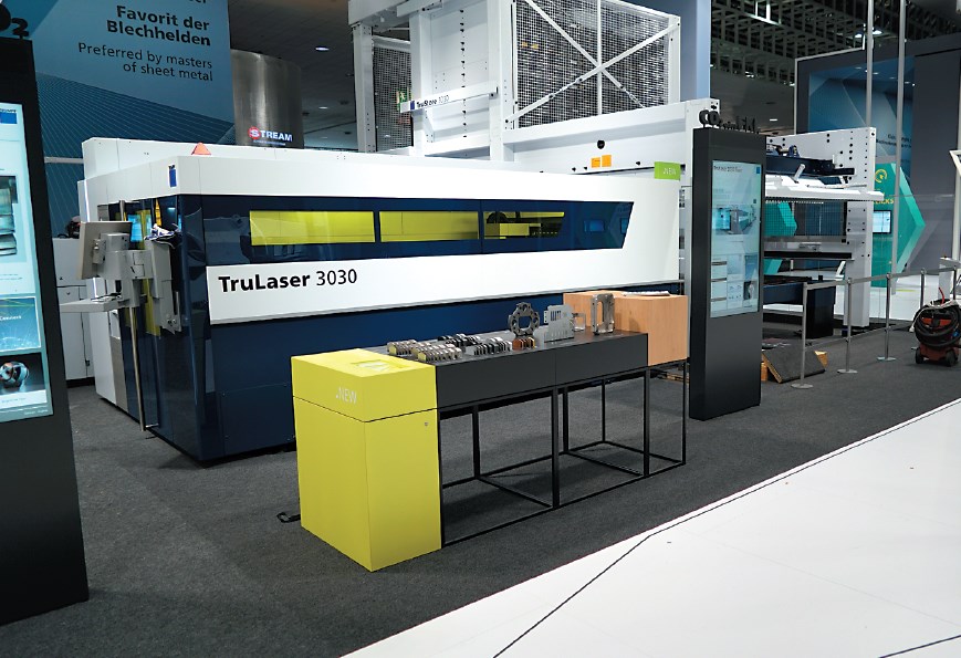 Еще один экспонат — абсолютно новая автоматизированная система для лазерного раскроя плоского листа TruLaser Center 7030. Идея этого станка родилась в результате изучения, обобщения и объединения всех циклов обработки металлического листа. В последнее время многие производители интенсивно наращивали скорость резки за счет увеличения мощности лазера, что значительно повышало стоимость системы и заметно снижало экономическую эффективность в случае остановки оборудования, например, из-за столкновения головки с деталью или из-за перекоса/падения детали при сортировке/разгрузке. Новинка TRUMPF — полностью автономная система, которая позволяет сортировать вырезанные из листа детали как в соответствующие стопки на деревянных паллетах, так и в предусмотренные конструкцией станка металлические лотки. Главное преимущество этого автоматизированного комплекса: подача материала в зону резки, его раскрой, выгрузка и сортировка готовых деталей наряду с удалением остаточной решетки объединены в один стабильный непрерывный процесс, не требующий участия оператора.