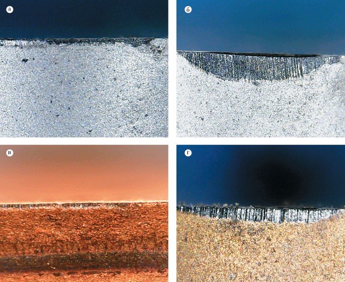 Рис. 1. Изношенные инструменты с покрытиями MoN/CrN (а, б) и (TiAlSiY)N (в, г)