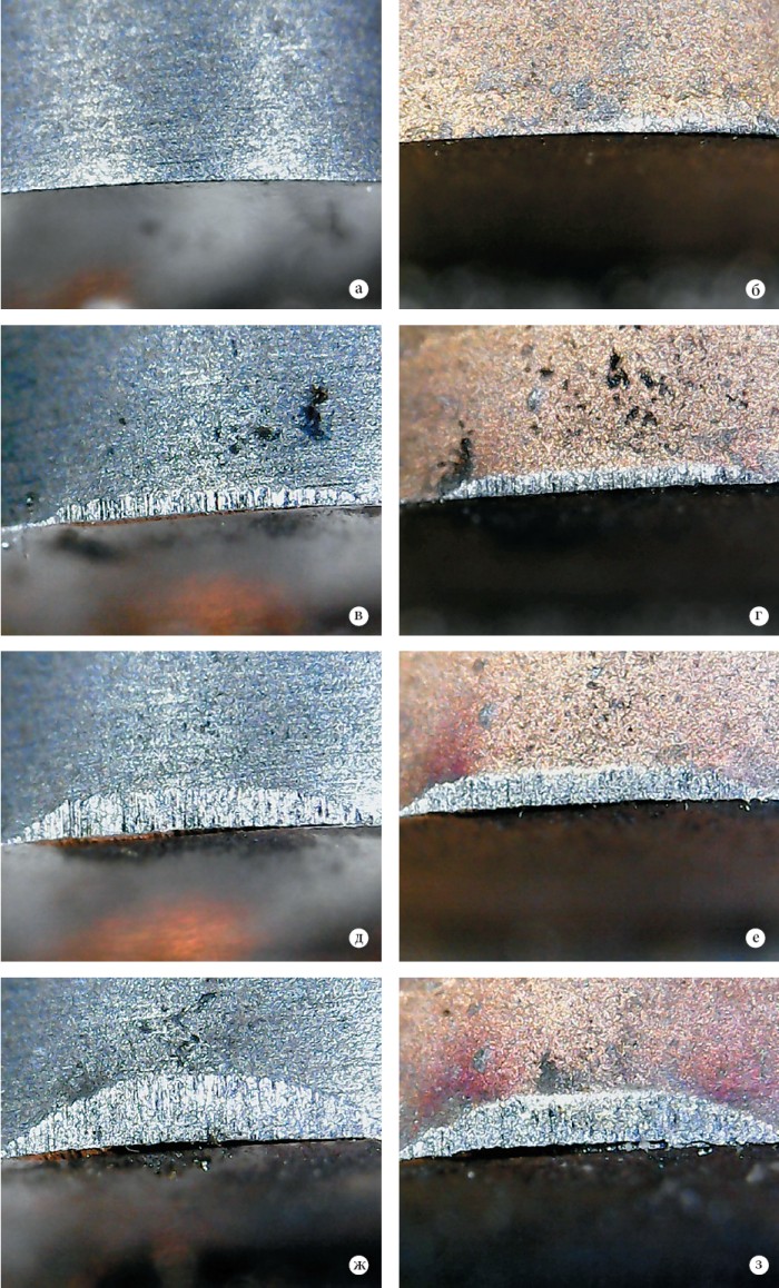 Рис. 3. Износ инструмента без покрытия (а, в, д, ж) и с покрытием (TiAlSiY)N (б, г, е, з):