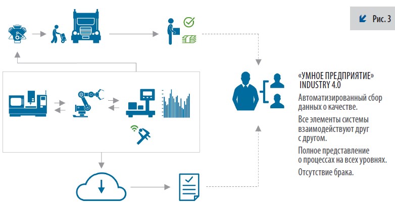 Раньше, когда обработка детали выполнялась на универсальном станке, производственник не мог вмешиваться в процесс изготовления, довольствуясь лишь определением, подходит этот процесс или нет. Но сегодня появились совершенно другие средства производства, например станки с ЧПУ, оперирующие точными цифрами, способные каждую последующую деталь делать на один миллиметр, микрон, доли микрона ближе к заданному параметру. То есть, мы пришли к тем самым требованиям «Industry 4.0», которая, по сути, является процессом обработки цифровых данных. В промышленных масштабах это совокупность информации, получаемой от станков и средств метрологического контроля, точно описывающей параметры изделия, что позволяет получать объективные знания о своем производстве и, соответственно, о качестве выпускаемой продукции, и при этом управлять процессом (рис. 1–3). Разумеется, это актуально для передовых предприятий, конкурирующих на мировом уровне. Для них качество — это величина безусловная, требующая серьезного подхода.