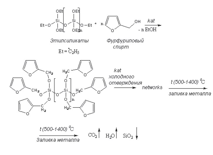 При заливке расплавленного металла в формы происходит процесс термической деструкции сетчатой структуры полимерного композиционного связующего. В результате этого процесса в атмосферу выделяются CO2 и пары H2Oи образуется твердый неорганический остаток SiO2.