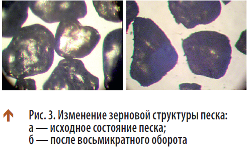 Для исследования структуры отработанных песков ХТС на смолах с олигофурфурилоксисилоксановым связующим был проведен следующий эксперимент. Образцыготовили по методике, приведенной ранее.Затем их помещали в муфельную печь и притемпературе 800 °С выдерживали в течениечаса. По истечении времени образцы рассыпались, и из песка снова изготовляли образцы. Этот процесс повторяли 8 раз. Каждыйраз изучали структуру зерен песка с помощью электронного микроскопа с увеличением в 112 раз. Со временем наблюдалось появление «бархатной» пыли на зернах песка.На рис. 3 представлены снимки песка в исходном состоянии и после восьмикратногооборота. Можно предположить, что «бархатная» пыль на зернах является коксовой составляющей смолы.