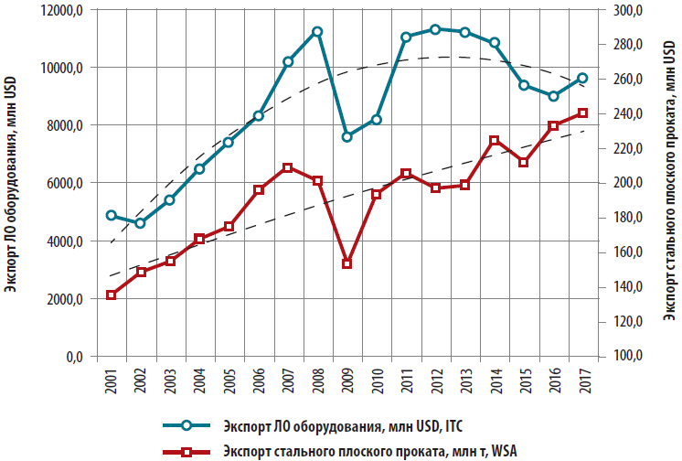 Рис. 1. Динамика мирового экспорта листообрабатывающего (ЛО) оборудованияи стального плоского проката