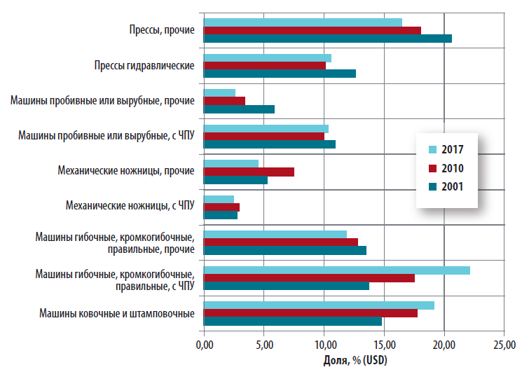 В 2001 г. лидерами продаж были прессы прочие (20,6 %), машины ковочные и штамповочные (14,8 %), а также машины гибочные, кромкогибочные, правильные с ЧПУ (13,8 %). Однако в 2017 г. ситуация несколько изменилась. На первое место вышли машины гибочные, кромкогибочные, правильные с ЧПУ (22,1 %), за ними — машины ковочные и штамповочные (19,2 %), далее — прессы прочие (16,5 %). Лидерами мирового экспорта ЛО оборудования в XXI веке являются три высокоразвитые промышленные страны: Германия, Италия и Япония (табл. 1), хотя их суммарная доля за отчетный период уменьшилась с 46,9 (2001 г.) до 39,9 % (2017 г.).