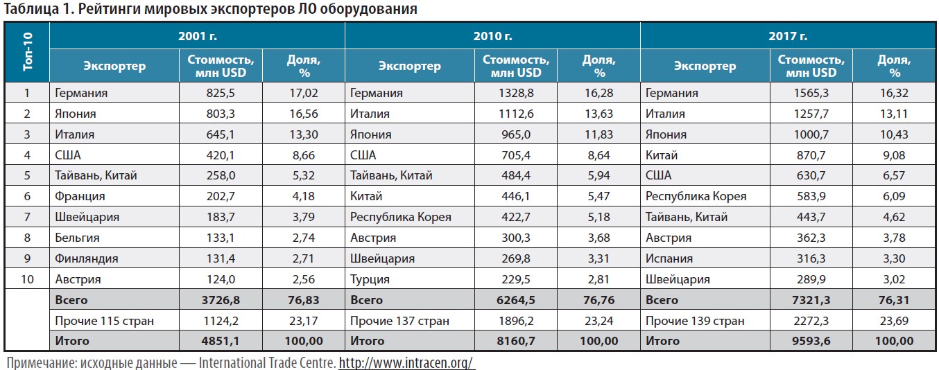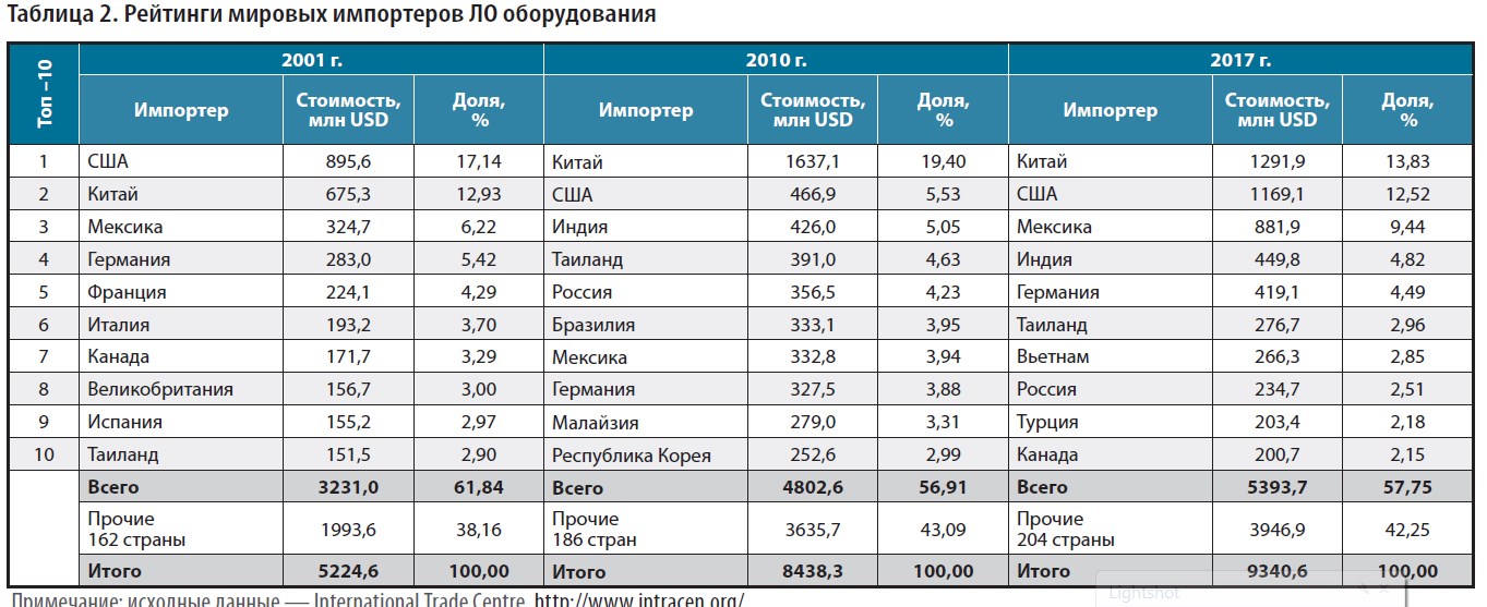 Конечно, возможны различные торговые схемы, однако цифры — вещь упрямая. Ведь если доля Топ-10 стран-импортеров с 2001 по 2017 гг. уменьшилась с 61,8 до 57,8 %, то доля прочих стран-импортеров возрослас 38,2 до 42,3 %. Бесспорными лидерами — импортерами ЛО оборудования в мировом измерении являются США, Китай, Мексика и Индия. Следует отметить, что Китай за период2001–2017 гг. увеличил закупки данного оборудования с 0,7 до 1,3 млрд. USD, или в 1,9 раза,в то время как США — с 0,9 до 1,2 млрд. USD, или в 1,3 раза. Налицо различие в темпах между «старой» промышленностью США и «молодой», интенсивно развивающейся промышленностью Китая.