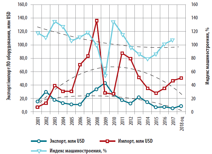 В мировом рейтинге стран — экспортеров ЛО оборудования Украина, исходя из данных ITC, в 2001 г. занимала 27 место (15,6 млн. USD), в 2010 г. — 29 место (25,8 млн. USD) и в 2017 г. — 45 место (5,5 млн. USD). Что касается импорта Украиной ЛО оборудования, то в рейтинге стран-импортеров в 2001 г. страна занимала 58 место (7,4 млн. USD), в 2010 г. — 44 место (27,5 млн. USD) и в 2017 г. — 40 место (43,4 млн. USD). В принципе, динамика украинского экспорта и импорта ЛО оборудования (рис. 3) четко отражает мировые рейтинги украинских производителей. Ясно одно — без ускоренного развития внутреннего украинского рынка машиностроительной продукции, особенно с учетом концепции «Индустрия4.0», Украине не продвинуться вверх в мировом экспортном рейтинге.