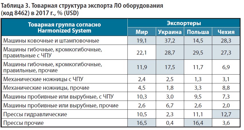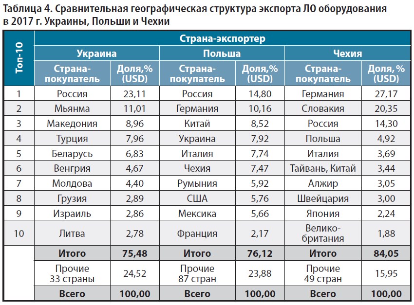 В частности, это - Россия. Ее доля в экспорте Украины составила в 2017 г. 23,1 %, Польши — 14,8 % и Чехии — 14,3 %. При этом следует отметить, что Польша и Чехия активно поставляют ЛО оборудование в Германию — 10,2 и 27,2 % соответственно. Следует отметить, что в Топ-10 покупателей Украины, за исключением России, отсутствуют страны, фигурирующие в Топ-10 Польши и Чехии. Причин такой ситуации, вероятно, много, и для их выявления требуется более глубокий анализ. Однако следует отметить то, что сразу бросается в глаза: торговыми партнерами Украины в поставках ЛО оборудования являются 43 страны против 97 у Польши и 59 у Чехии. Так что украинские производители имеют прекрасные ориентиры.