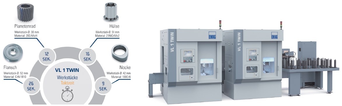 Он предназначен для обработки деталей диаметром до 75 миллиметров, благодаря своим достоинствам, таким как: высокая динамика, точность и надежность производственного процесса, задает определенный тренд выставочной экспозиции EMAG. В VL 1 TWIN эти свойства обеспечены двумя рабочими PickUp шпинделями (9,9 кВт/136 Н·м при 40 % ПВ) — они самостоятельно захватывают с транспортера две идентичные заготовки, перемещают их в рабочую зону и одновременно их обрабатывают. При этом важно отметить следующее: диаметр и длину (оси X/Z) для каждой из деталей можно корректировать независимо друг от друга благодаря независимому перемещению шпиндельных бабок. Дополнительное повышение динамики, точности воспроизведения перемещений и длительное сохранение точности синхронной обработки обеспечивает линейный двигатель на оси X в сочетании с системой прямого измерения (стеклянная линейка). Цельная станина станка из синтетического гранита Mineralit® и направляющие качения с циркуляцией роликов типоразмера 45 гарантируют необходимую стабильность при токарной обработке. Кроме того, при помощи системы автоматизации собственной разработки TrackMotion можно объединить в одну цепочку несколько станков VL 1 TWIN, либо встраивать станок в другие производственные линии, EMAG Modular Solutions (модульные решения). Таким образом, появляется возможность полной обработки кулачков, планетарных или солнечных шестерен, втулок или колец подшипников качения с сохранением высокой стабильности и надежности технологического процесса.