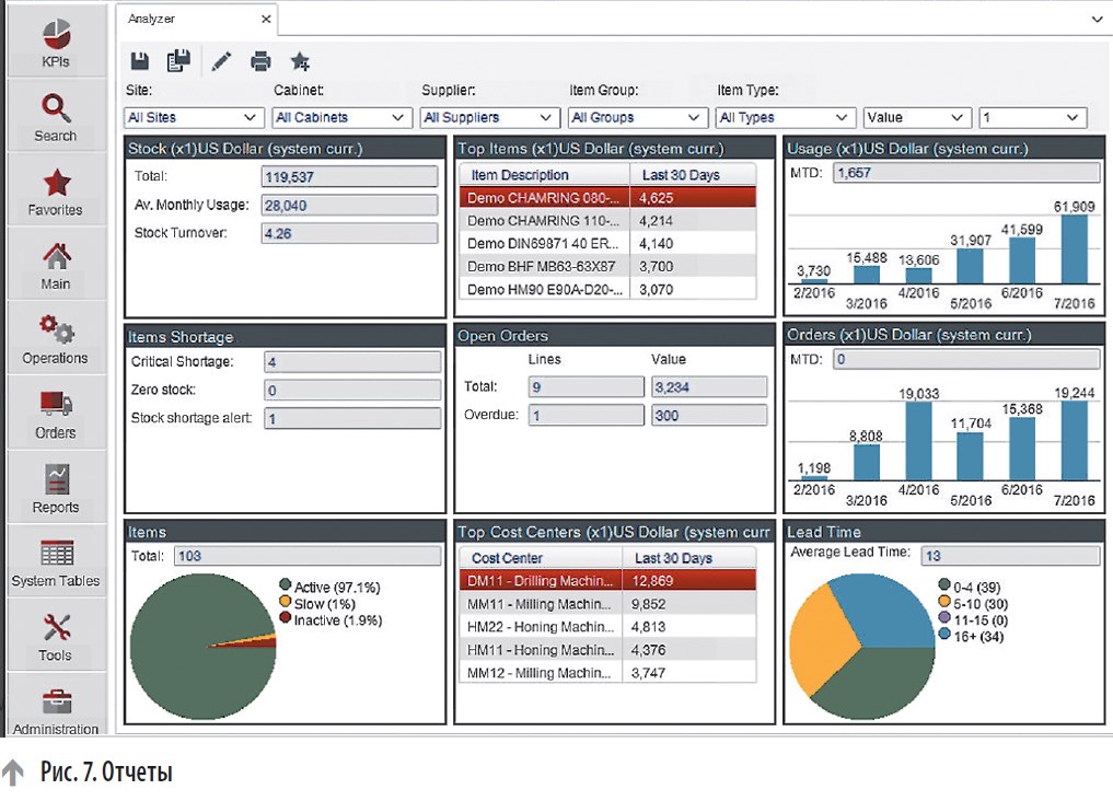 Данное решение может по праву называться первым шагом во внедрении в украинское производство такого понятия, как «интернет промышленных вещей», или«IIoT», так как позволяет автоматически, в соответствии с заранее прописанными протоколами, обмениваться данными с другими производственными объектами, создавать на базе полученного потока данных большее количество отчетов (рис. 7), таких как: остатки склада, дефицит, движение инструмента, различные типы затрат, приход инструмента на склад, информация по выдаче пользователям и другие, каждый из которых можно гибко настроить и вывести нужную информацию в соответствующий отчет. Отчеты могут приходить на заданные администратором электронные адреса или в определенную локальную (сетевую) папку с выбранным пользователем интервалом времени, с заданной периодичностью, например каждую пятницу или последний день месяца.