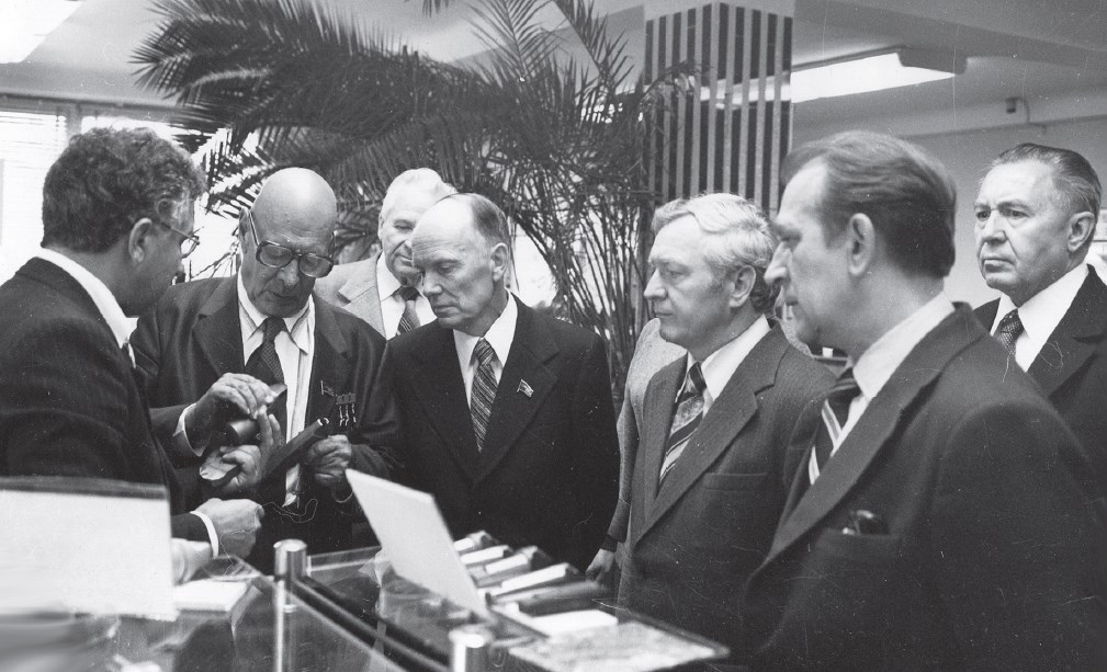 Проф. Э. В. Рыжов с академиками АН СССР А. П. Александровым, Г. И. Марчуком, Б. Е. Патоном, академиком АН УССР Н. В. Новиковым.