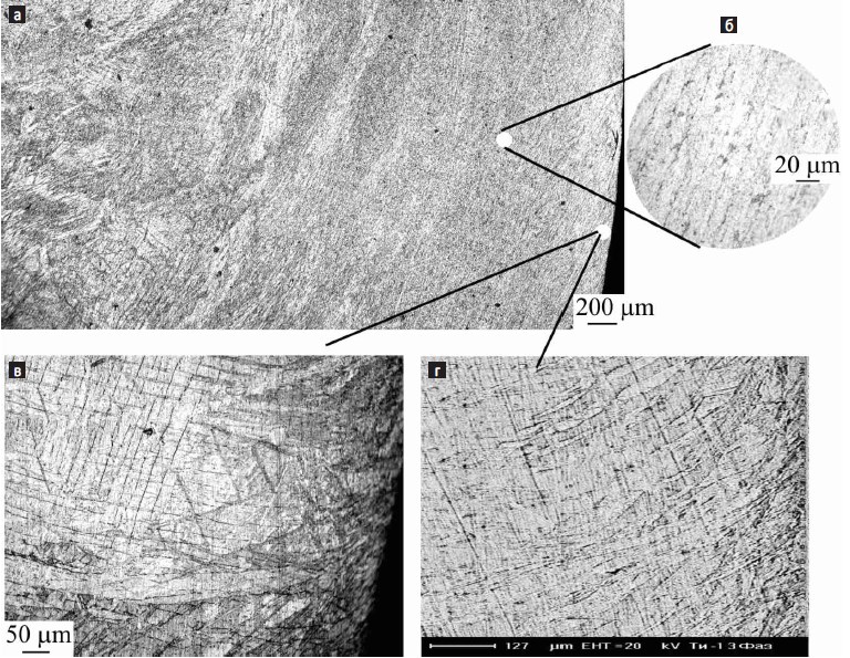 По мере приближения к поверхности наблюдаются измельчение зерен и изменение морфологии, выделенная α-фаза приобретает глобулярную форму (рис. 3б). При этом глобули выстраиваются в направлении бывших пластин, т. е. проявляется текстура деформации.