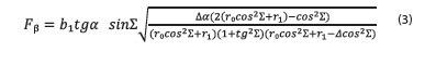 В процессе обработки тангенциальным шевингованием максимального значения угол ΔV достигает при врезании и выходе шевера и приближается к нулевому значению при максимальных деформациях технологической системы. Длина пятна контакта в этом случае уменьшается, что приводит к врезанию режущих зубцов шевера на большую глубину в начале и конце цикла обработки. Длина пятна контакта является функцией параметров станочного зацепления, а для случая обработки тангенциальным методом шевингования длина линии контакта будет составлять не менее половины ширины зуба заготовки (Уминский С. М. Исследование влияния параметров станочного зацепления на точность отделки при шевинговании методом тангенциальной подачи//Физические и компьютерные технологии в народном хозяйстве: труды 8‑й Международной научно-технической конференции. Харьков: ХНПК, 2003. С. 56–61; Соколов В. Н. Повышение эффективности шевингования зубчатых колес. Сборник 1: Пути повышения точности обработки зубчатых колес. М.: Машгиз, 1954). Погрешность направления зуба в этом случае определяется зависимостью: