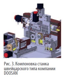 Рассмотрим компоновку станка для продольного точения швейцарского типа на примере обрабатывающего центра компании DOOSAN.
