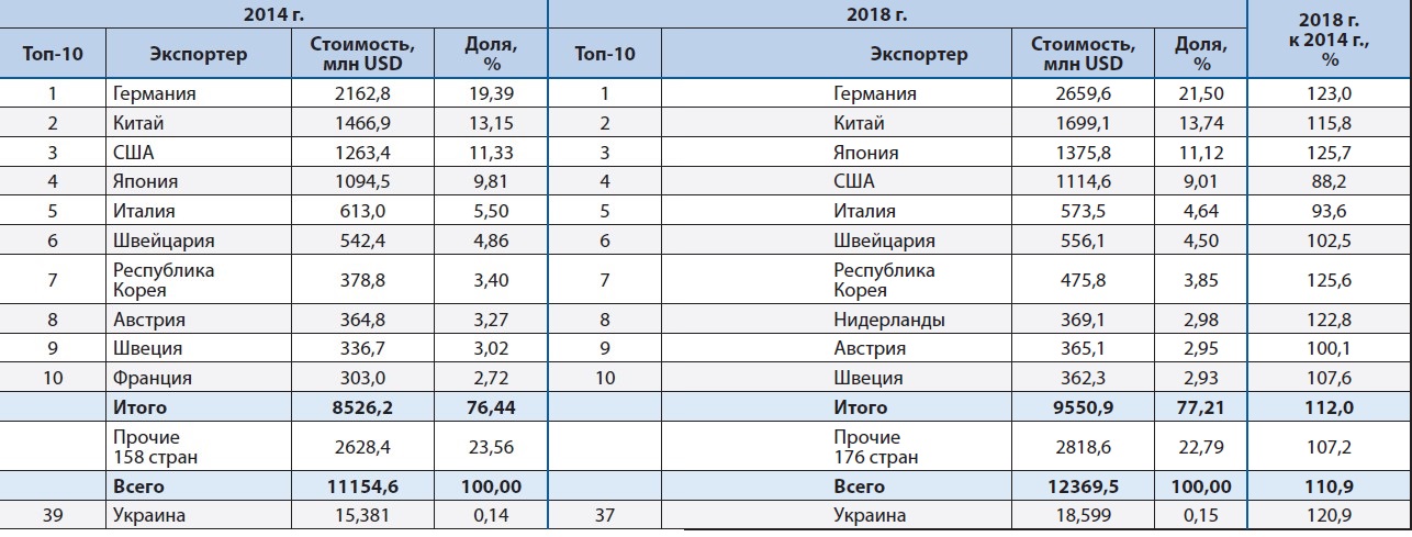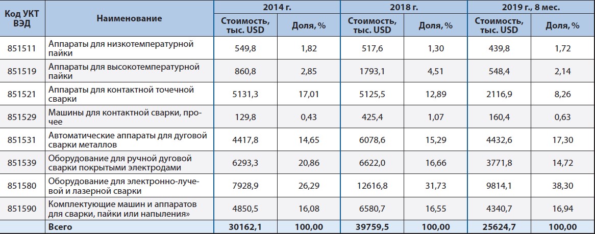 Украинские компании импортируют сварочное оборудование в значительно меньших масштабах. В 2014 г. и в 2018 г. цифры приблизительно одинаковы: 30,2 и 39,8 млн USD соответственно (см. табл. 3). Если исходить из данных Государственной службы статистики Украины за 8 месяцев 2019 г., то по итогам 2019 г. будет импортировано сварочного оборудования на сумму около 38,4 млн USD, или на 3 % меньше, чем было поставлено в 2018 г.