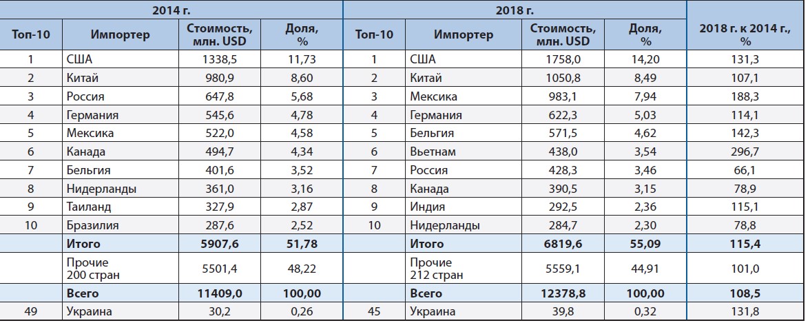 Украина в мировом экспортном рейтинге сварочного оборудования занимает достаточно скромное 37 и 39 место с долей на рынке экспорта украинской продукции 0,14…0,15 % (см. табл. 1). Хотя следует отметить, что в стоимостном измерении в 2018 г. экспорт увеличился по сравнению с 2014 г. на 20,9 %.