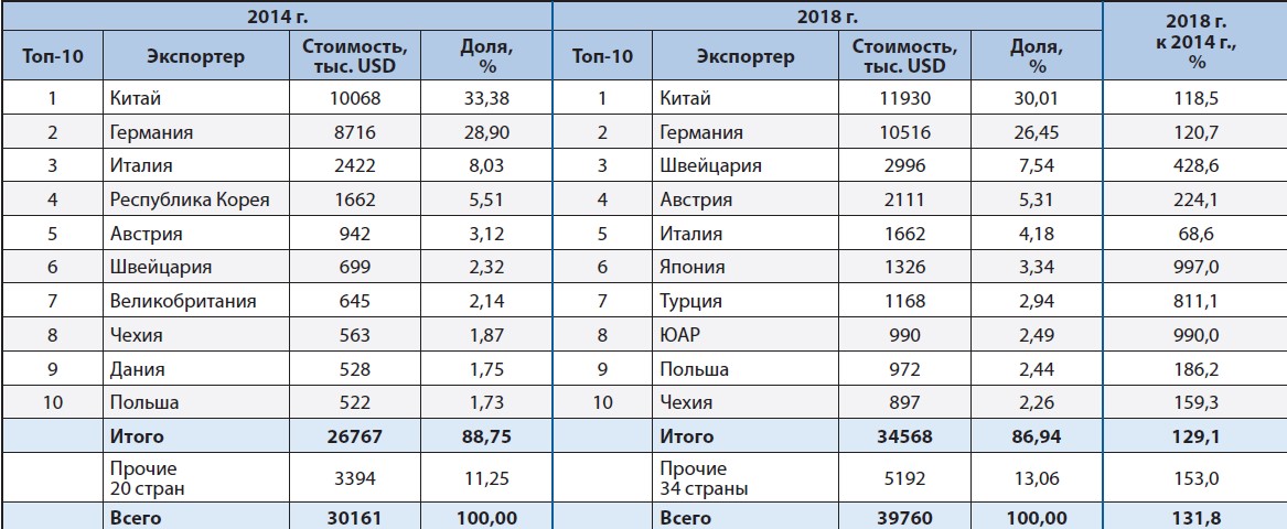 Рейтинги мировых экспортеров сварочного оборудования (код ГС 8515) в 2014 и 2018 гг. свидетельствуют о достаточно стабильной ситуации в Топ‑10 (табл. 1). Однако имеет место значительная монополизация на данном рынке: доля стран-экспортеров Топ‑10 составляет более 75 %.