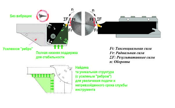 К операциям обработки канавок и отрезки при изготовлении сложных изделий из труднообрабатываемых материалов машиностроители всё чаще предъявляют повышенные требования. Невысокая эффективность и низкая надежность традиционно применяемых для этого технических решений и техпроцессов, как правило, связаны с большим вылетом инструмента, малой жесткостью его конструкции и, как следствие, низкой виброустойчивостью. Затрудненные условия формирования стружки, интенсивное трение, ограниченные возможности отвода тепла из зоны резания и невысокая эффективность СОЖ, в сочетании с вибрацией, приводят к перегреву режущих кромок инструмента и, в результате, к их преждевременному износу и выкрашиванию.