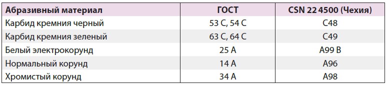 Таблица 1. Обозначение абразивных порошков по ГОСТ и CSN 22 4500 (Чехия)
