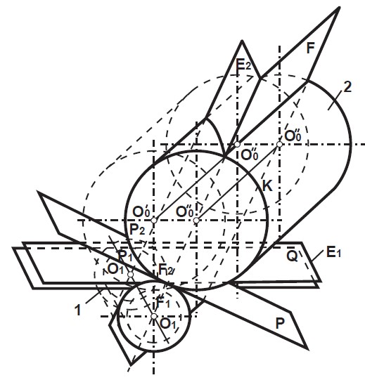 У результаті здійснення таких додаткових переміщень досягається зсув центра схрещування осей у необхідне положення (див. рис. 1).