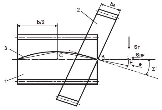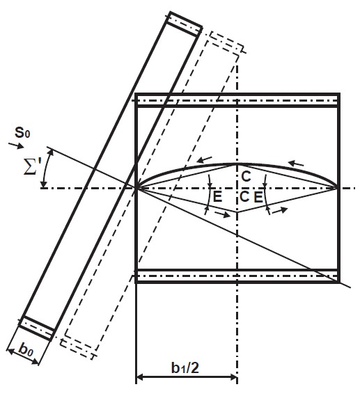 Для формування бочкоподібної форми зуба при шевінгуванні заготовці необхідно надавати подачу вздовж її осі та додаткову подачу за нормальною віссю заготовки (діагональну подачу). У результаті зміни міжосьової відстані при шевінгуванні кут схрещування осей шевера та заготовки у вихідному положенні Σ1 відрізняться від розрахункового кута схрещування Σ , прийнятого при відомих діагональних методах.