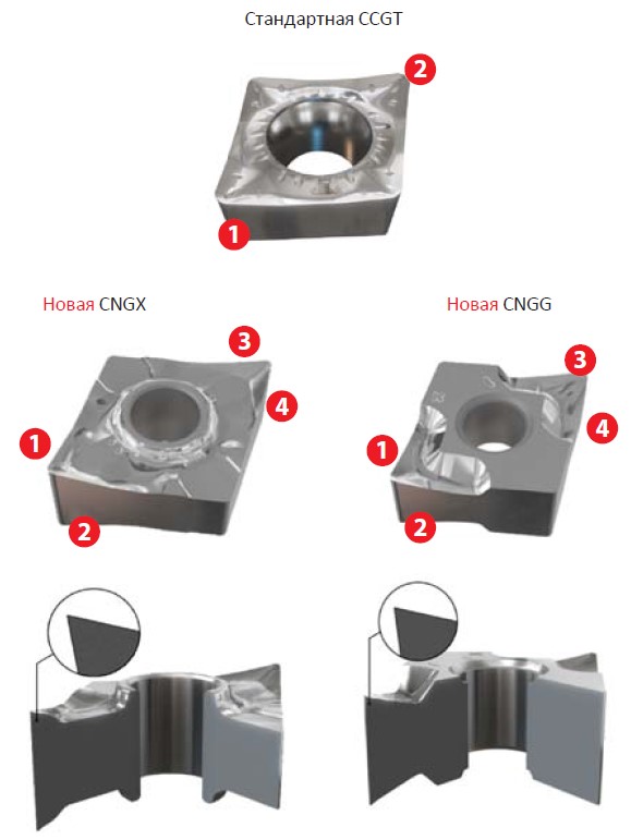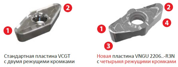 Новые пластины CNGG и CNGX с четырьмя кромками прекрасно заменяют стандартные двухкромочные пластины CCGT любого производителя.