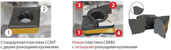 Экономичное решение ISCAR в виде двусторонних прочных пластин CXMG с четырьмя режущими кромками с лёгкостью заменяет стандартные аналоги с двумя кромками типа CCMT (рис. 2).