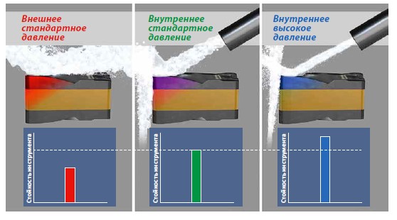 Рис. 2. Стойкость инструмента при подаче СОЖ с разным давлением и способом (внешним или внутренним)