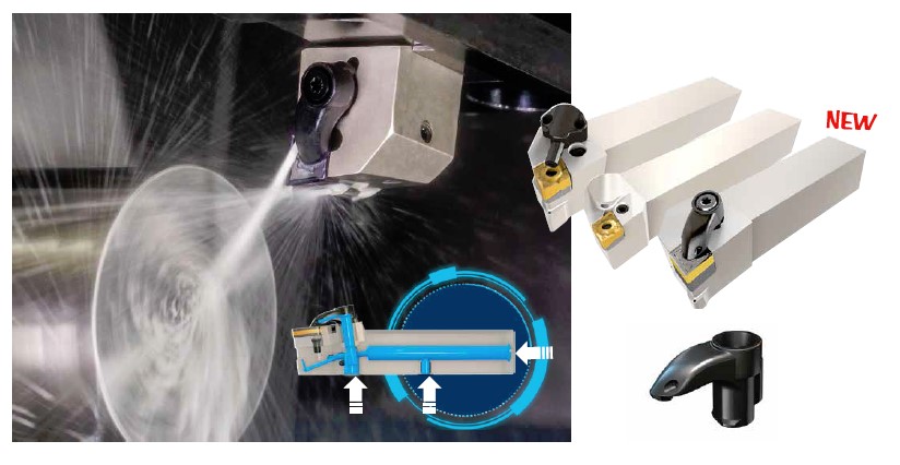 Серия инструмента VDI-JHPMC дополнена специально разработанными для точения и нарезания канавок блоками VDI, оснащенными входными каналами, расположенными на нижней плоскости державок. Они предназначены для подвода охлаждающей жидкости (рис. 8) и позволяют регулировать вылет инструмента.