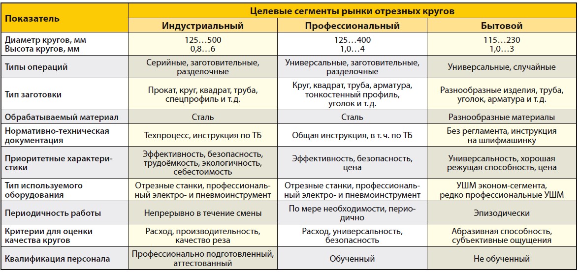 Критерии и характеристики, согласно которым отрезные круги относятся к определенному сегменту рынка, представлены в табл. 1.