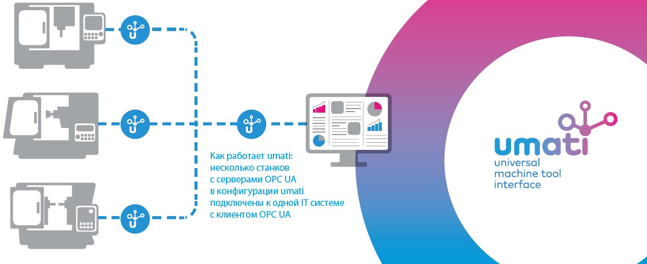 umati является общим брендом всех компаний, которые объединились для внедрения стандартов OPC UA в машиностроение и промышленное производство. Он формирует основу для совместного маркетинга, PR, демонстрации вариантов использования и донесения информации конечному пользователю. Основой для этого является фактическая стандартизация интерфейса OPC UA для различных отраслей машиностроения.