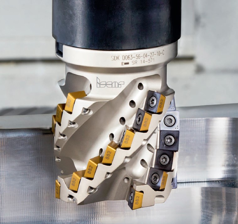 Трудно найти процесс изготовления детали больших размеров без операций фрезерования плоских поверхностей. Для выполнения таких операций требуются различные конструкции фрез. Торцевые фрезы со сменными пластинами (СМП) стандартного исполнения ISCAR выпускаются с диаметром до 315 мм, специализированные исполнения характеризуются значительно большими величинами. Пластины фрез служат для обработки разных конструкционных материалов, например сталь, чугун, титан, и, соответственно, отличаются режущей геометрией.