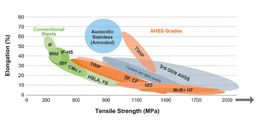 Семейство AHSS включает в себя двухфазные стали (DP), многофазные стали (CP), феррито-бейнитные стали (FB), мартенситные стали (MS), стали с пластичностью, наведенной превращением (TRIP), горячештамповочные и закаленные стали (HF), а также стали повышенной пластичности, инициируемые двойникованием (TWIP).