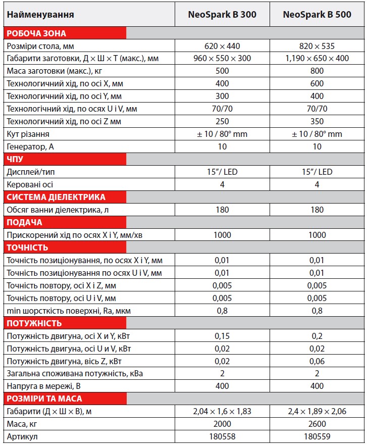 Таблиця 1. Технічні характеристики верстатів NeoSpark B 300, B 500