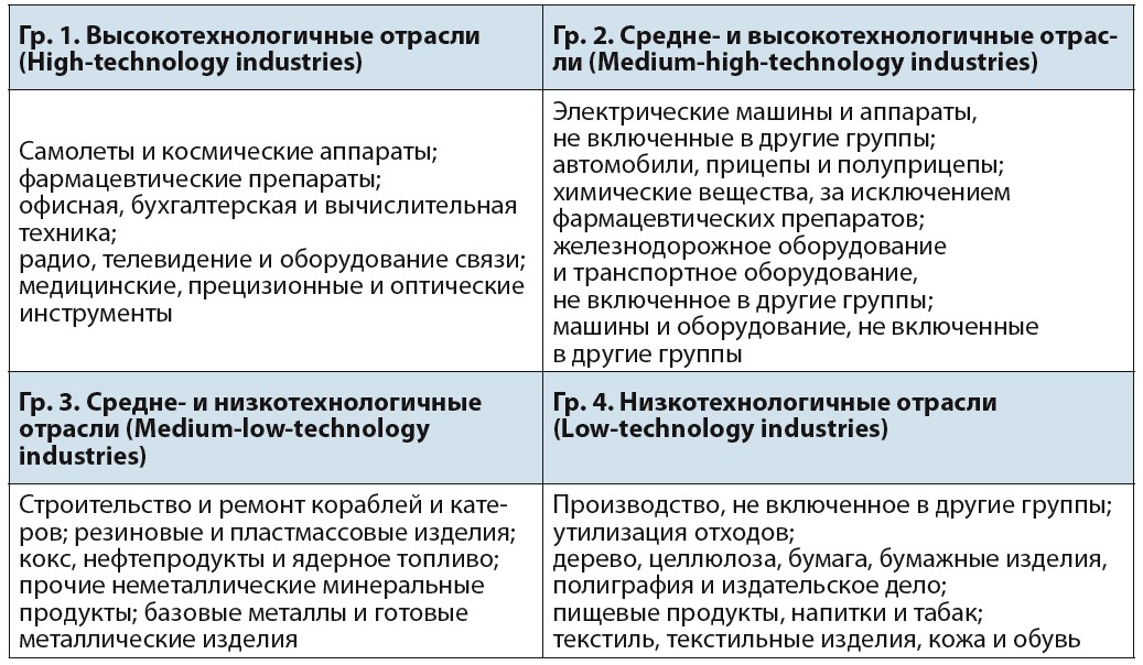 Источник: ISIC REV. 3 TECHNOLOGY INTENSITY DEFINITION . OECD Directorate for Science, Technology and Industry. Economic Analysis and Statistics Division . 7 July, 2011. https://www.oecd.org/sti/ind/48350231.pdf