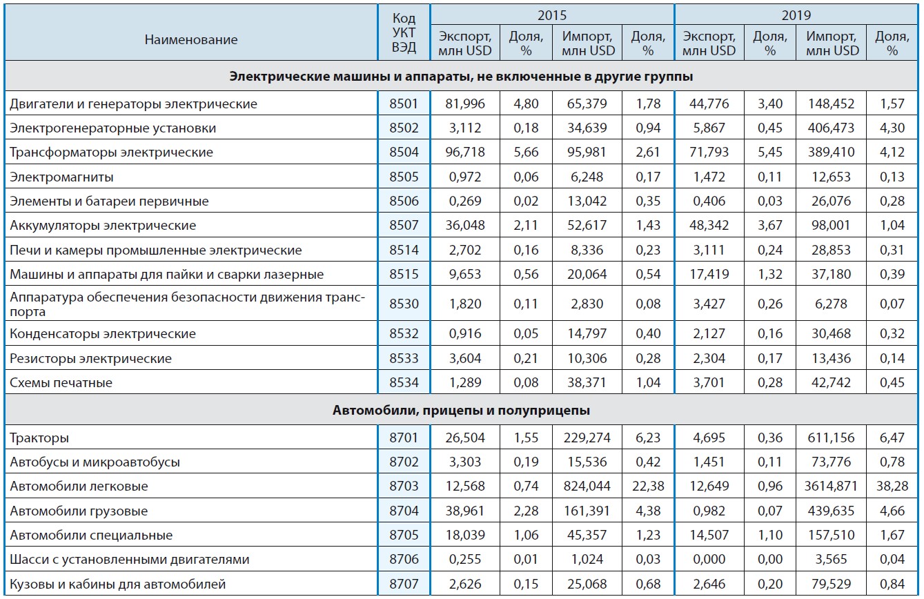 В 2019 г. по сравнению с 2015 г. определенные изменения имеют место и в товарной структуре экспорта/импорта высокотехнологичной продукции (гр. 1). Если в 2015 г. лидерами экспорта были летательные аппараты (код 8802) — 25,3 %, телефонные аппараты (код 8517) — 21,3 % и мониторы (код 8528) — 14,4 %, то в 2019 г. на первое место вышли телефонные аппараты (код 8517) — 49,1 %, а за ними следовали приборы для автоматического регулирования (код 9032) — 9,1 % и мониторы (код 8528) — 6,0 % (см. табл. 2).