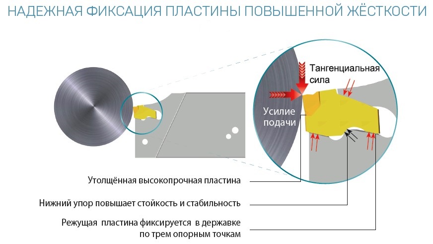 Такое решение (благодаря стабилизации пластины и стойкости инструмента) позволяет повысить качество обработанной поверхности даже при тяжёлых условиях работы.