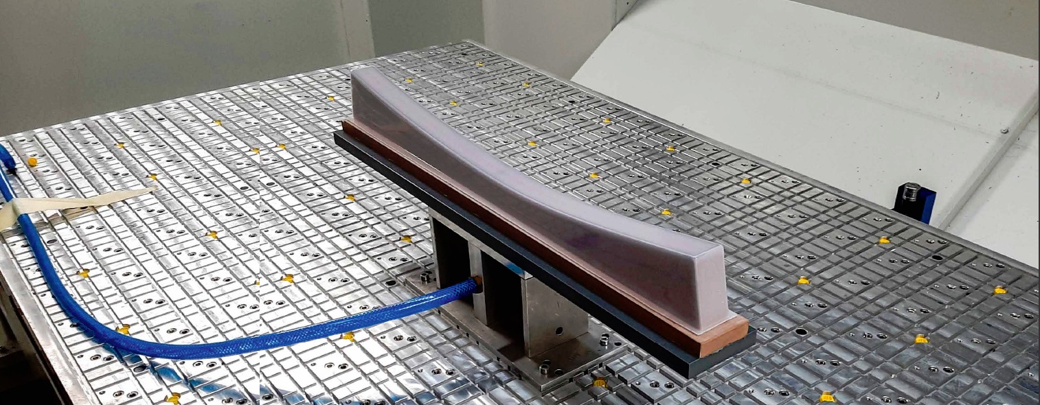 Фраза «незначительные изменения», вероятно, не совсем точна, потому что у Kruger Aviation был непростой запрос. Для фиксации полой заготовки сложной формы в HG Grimme разработали вакуумный стол, позволяющий фрезеровать на высокой скорости безопасно и без вибраций. До сих пор разработанные в компании вакуумные зажимные приспособления изготавливались из древесины или уреола (Ureol®). Теперь HG Grimme должен был изготовить прочную оснастку полностью из алюминия. Стремление повысить прочность зажимного стола понятно, поскольку скорость перемещения обрабатывающей головки по осям X/Y на новых портальных станках достигает 80 метров в минуту.
