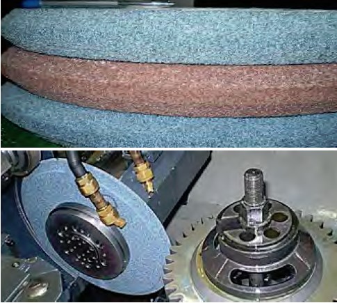 Рис. 3. Високопористі шліфувальні круги з білого корунду А99 і монокорундів WG9 і 3SG (а) та розташування шліфувального круга на верстаті (б)