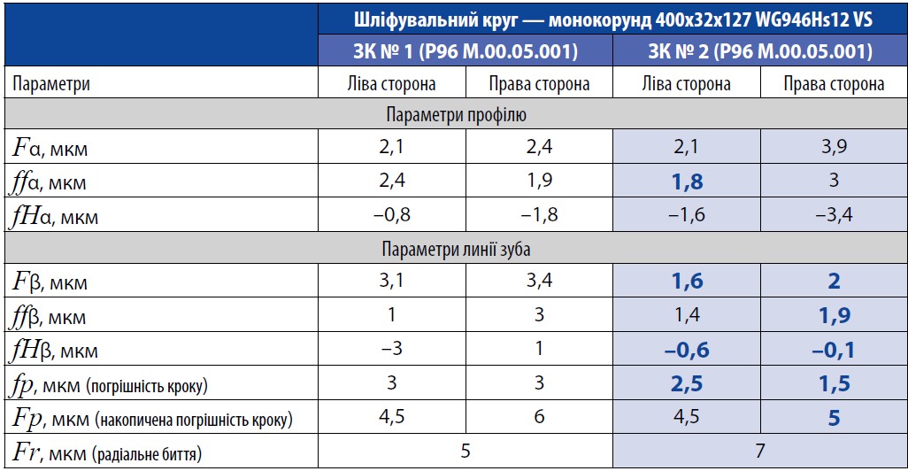 При використанні високопористого круга з монокорунду WG946 Hs12 VS отримано такі показники точності зубчастих коліс (табл. 1).