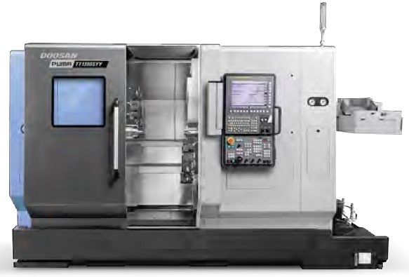 PUMA TT1800SY — проверенная временем и достаточно экономичная модель, не теряющая своей актуальности и сегодня (рис. 5). Станок имеет ось Y на левой револьверной голове. Максимальный диаметр прутка — 65 мм, максимальный диаметр точения — 230 мм и рекомендуемый размер патрона — 210 мм. Его встроенный мотор-шпиндель мощностью 22 кВт и скоростью вращения 5000 об/мин сочетается с верхней и нижней револьверными головами. Револьверы могут работать с приводными инструментами со скоростью 5 000 об/мин и мощностью 5,5 кВт. Конструкция шпинделя TT1800SY представляет собой встроенный двигатель, который обеспечивает минимальную вибрацию и впечатляющую точность.