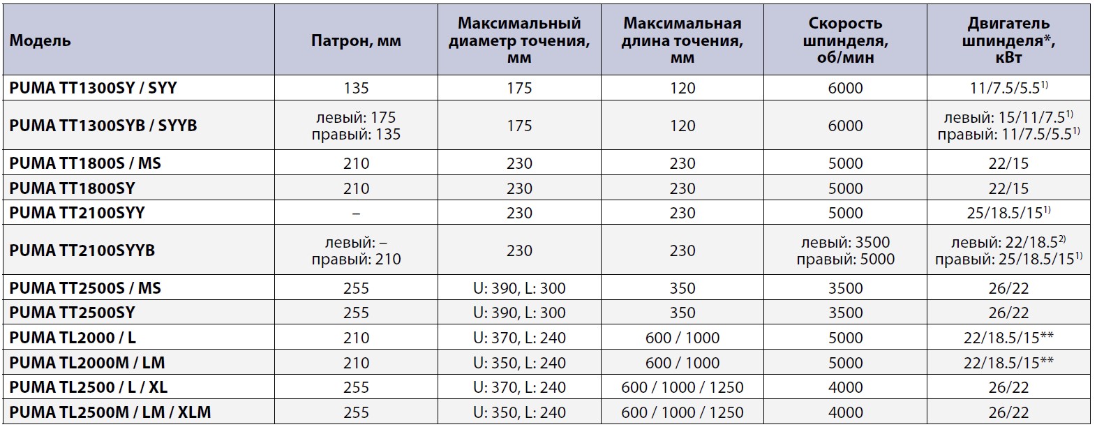 Таблица 1. Основные технические характеристики моделей серии PUMA TT