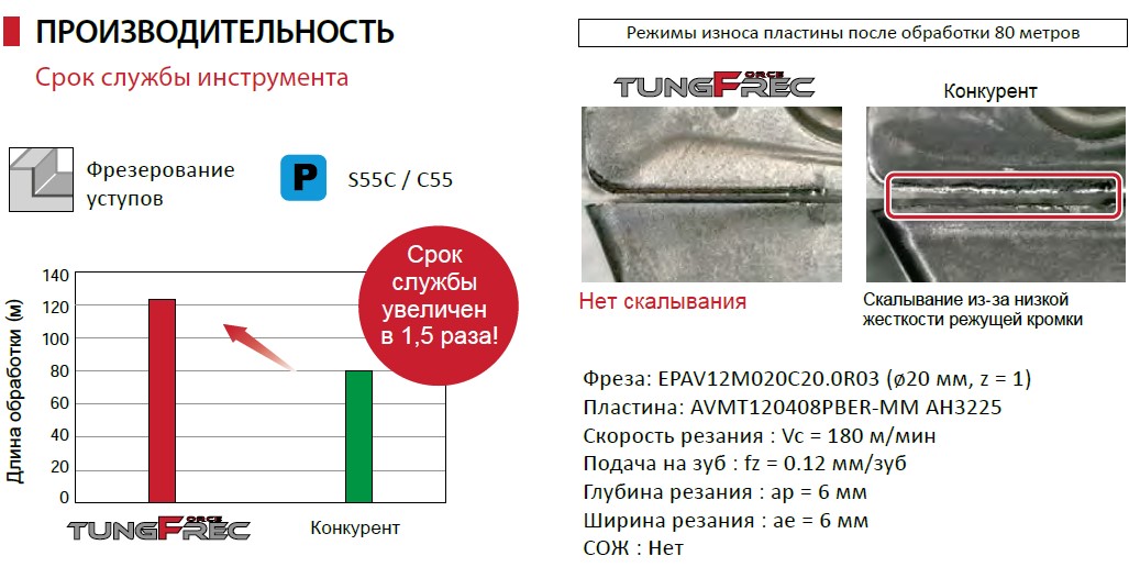 Фрезы серии TungForceRec 12 могут «похвастаться» в 1,5 раза бoльшим количеством зубьев, чем аналоги того же размера: так, например: фрезы диаметром 16 мм (5/8ˮ) имеют 3 зуба и 12 — фрезы диаметром 50 мм (2ˮ). Благодаря этому новый инструмент для обработки уступов может работать с более высокой подачей на зуб.