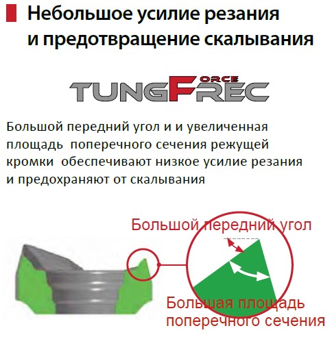 TungForce-Rec — это серия фрез для обработки уступов и фрезерования пазов. Характеризуется надежной системой крепления пластин, которая гарантирует высокий уровень жесткости, что дает возможность выполнять операции на высоких режимах резания, обеспечивая высокий класс чистоты поверхности. Обладая всеми преимуществами 6‑миллиметровых пластин с V‑образной посадочной поверхностью, новые, 12‑миллиметровые пластины имеют вдвое увеличенную режущую кромку. Корпус новой фрезы столь же жесткий, как и у предшествующей серии TungForce-Rec 06. Уникальная форма посадочной поверхности для базирования режущих пластин дает ряд технических преимуществ,в том числе использование винтов с большей опорной поверхностью витков резьбы, позволяющей более надежно их фиксировать. Также конструкция обладает повышенным запасом прочности благодаря увеличению диаметра опорного сердечника инструмента.