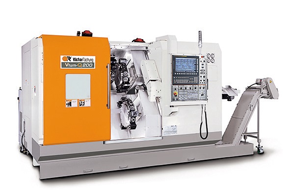 Vturn-Q200 Три револьверні головки з приводними станціями, роздільні осі Y і два мотор-шпинделя Max габарити заготовки: Ø300 х 850 мм Токарні шпинделі: 5000 об/хв Приводний інструмент: 6000 об/хв Вага 11200 кг | ЧПК FANUC |