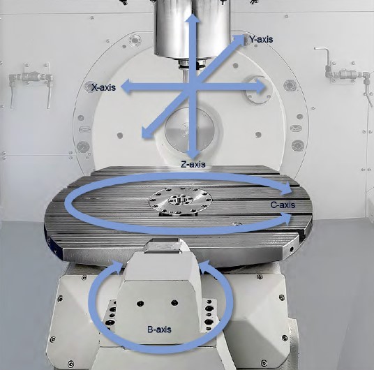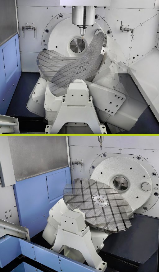 DVF 5000 другого покоління включає в себе високошвидкісний сервомагазин як стандартну функцію. Завдяки високій жорсткості та точності напрямних роликового типу LM конструкція верстата легко витримує навантаження в 400 кг і забезпечує високу продуктивність. Механізм повороту осей В і С демонструє високу точність обертання з допуском 0,0001 градуса. Крім того, IKC (Intelligent Kinematic Compensation) вміло компенсує помилки центра осі обертання.