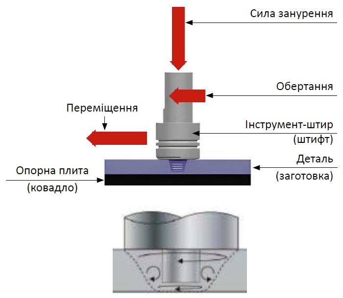 Концепція технології полягає в тому, що спеціальний обертовий інструмент рухається вздовж стику між двома деталями. Завдяки тертю та пластичній деформації в зоні контакту генерується тепло, достатнє для пластичного розм’якшення, але не плавлення металу. Матеріал у зоні зварювання інтенсивно перемішується, ущільнюється та формує монолітний шов під дією осьового навантаження та опорної поверхні інструмента. FSW найчастіше використовується для з’єднання легких кольорових металів, таких як алюміній і магній, а також деяких мідних і високоміцних алюмінієвих сплавів.